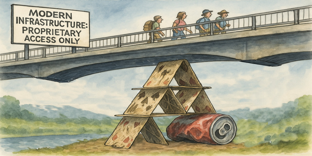 Now, more than a quarter century later, we find ourselves living inside what feels like an empty shell of a modern world, where the appearance of progress has overtaken the importance of actual progress. Many of the most loudly advertised advancements are little more than marketing slogans wrapped around aging foundations, meant to convince us that superficial upgrades constitute genuine evolution. In reality, vast portions of our technological sphere have become enbleepified and over-complicated, not for our benefit, but for the vendor's control, inaccessible not for reasons of safety, but of exclusivity, and riddled with fragile subsystems held together by layers of patches, permissions, and proprietary gates. What passes for innovation now is too often an attempt to extract revenue for infrastructures that barely remain standing, and whose complexity no longer reflects deep understanding but sagging, institutional momentum. The tragic irony is that these same systems, while unstable and opaque, have captured near-total control over even the newest knowledge, ensuring that society depends on them even as they erode beneath our feet.
